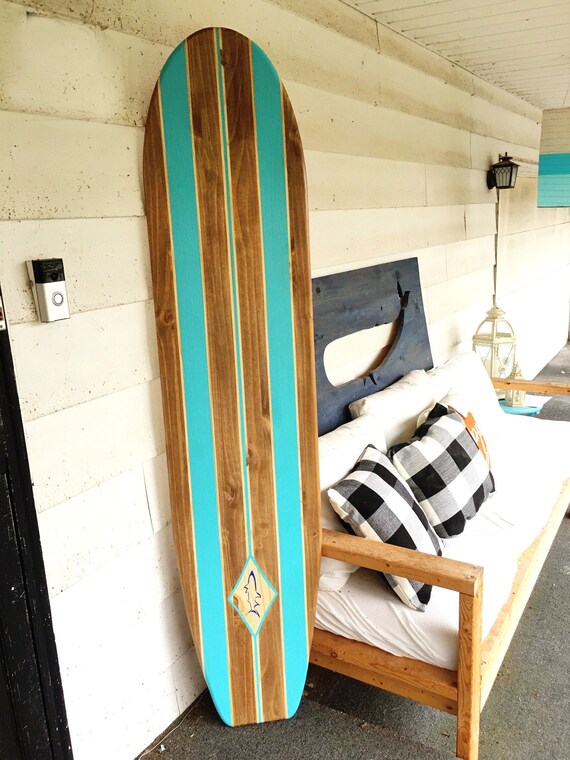 6 Foot Wood Surfboard Wall Art With Multiple Painted Stained And Natural Stripes With Diamond And Shark Etsy